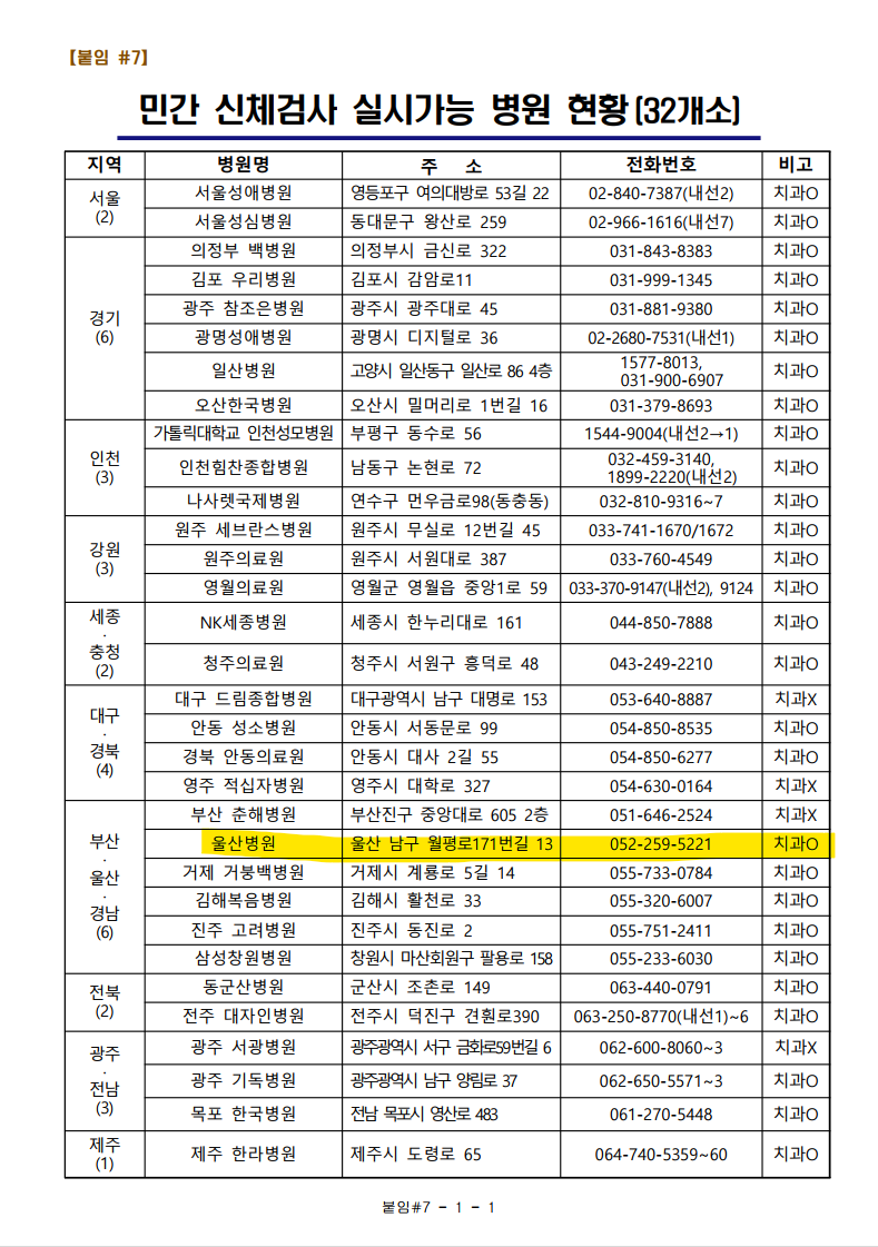 민간협약 병원 (국·공립 병원, 종합병원 32개 / 개인 비용발생)